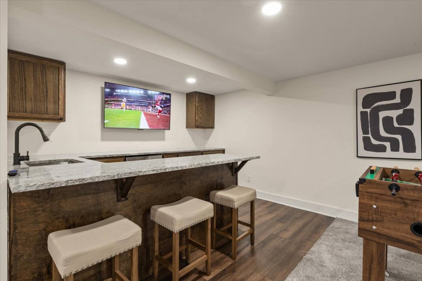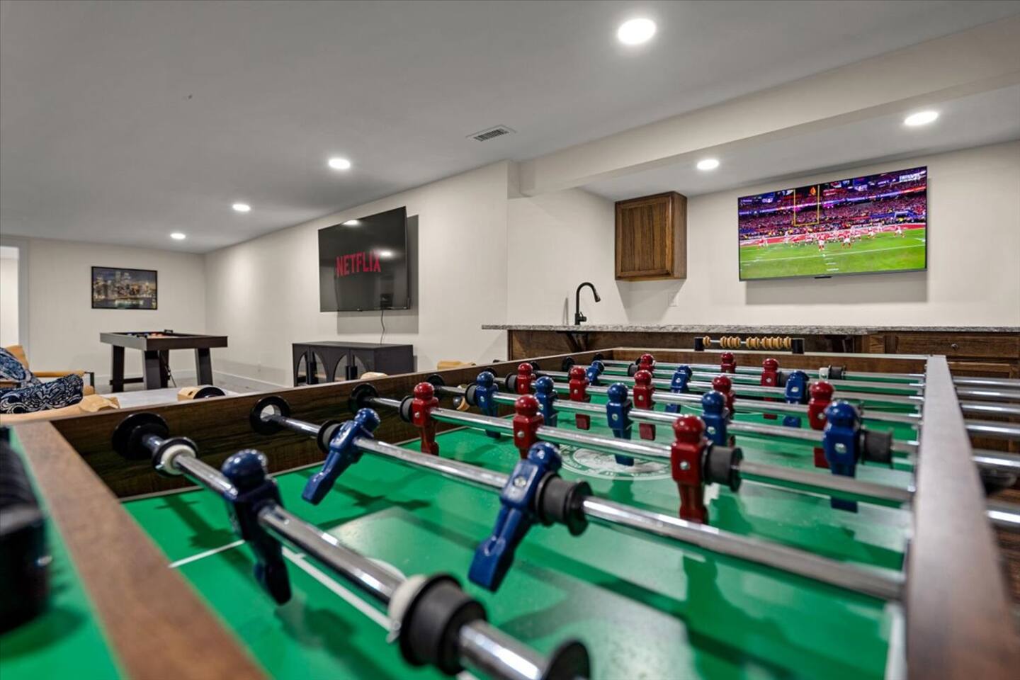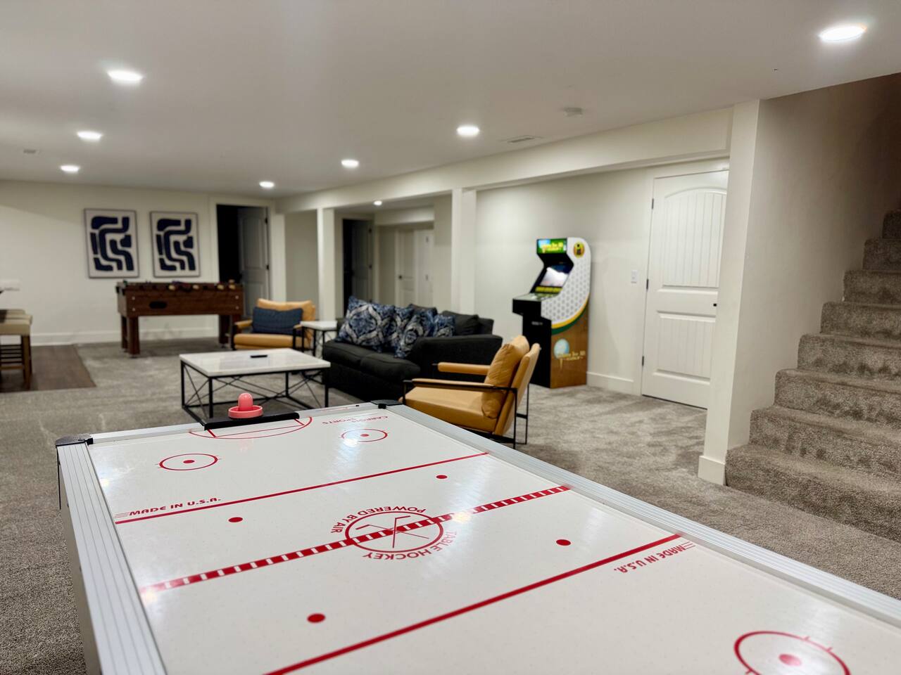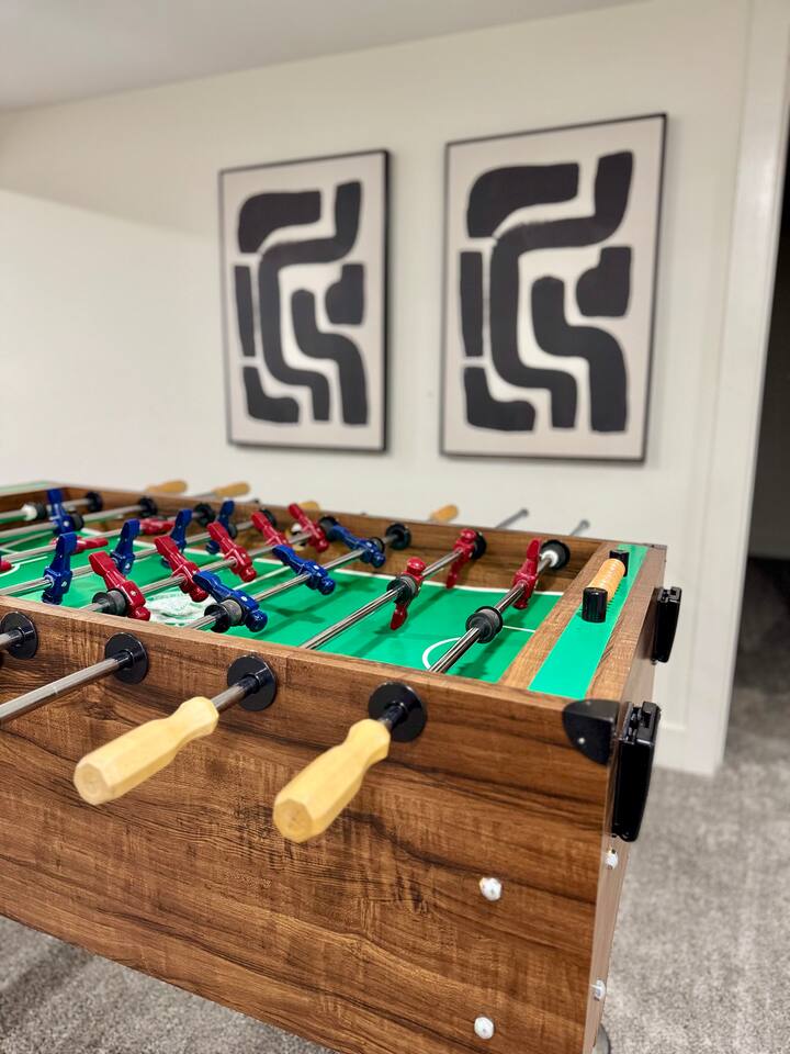 This stylish ranch home is perfect for groups or families. With multiple living spaces, our newly renovated home has room to spread out for fun or work and is equipped with 1Gb Wifi. Only MINUTES from Overland Park Convention Center, shopping center, and highway access to get anywhere quickly. Modern updates all throughout, plush beds with luxurious linens, fully stocked kitchen with laundry. A bar in the basement along with an air hockey table gives this place tons of fun entertainment.