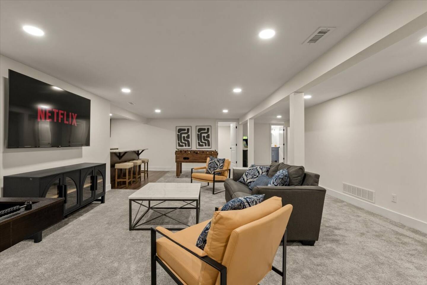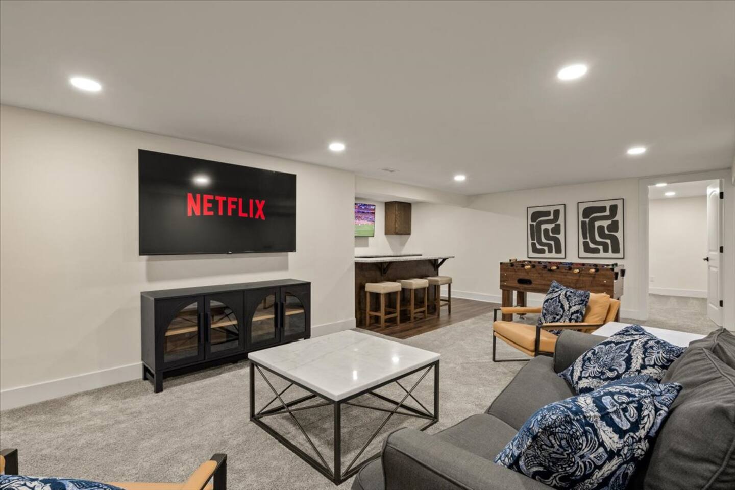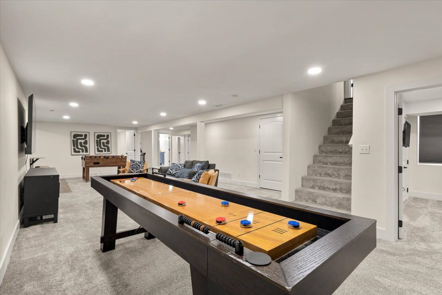 This stylish ranch home is perfect for groups or families. With multiple living spaces, our newly renovated home has room to spread out for fun or work and is equipped with 1Gb Wifi. Only MINUTES from Overland Park Convention Center, shopping center, and highway access to get anywhere quickly. Modern updates all throughout, plush beds with luxurious linens, fully stocked kitchen with laundry. A bar in the basement along with an air hockey table gives this place tons of fun entertainment.