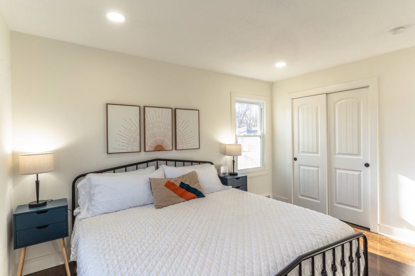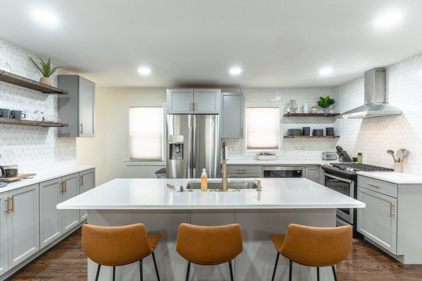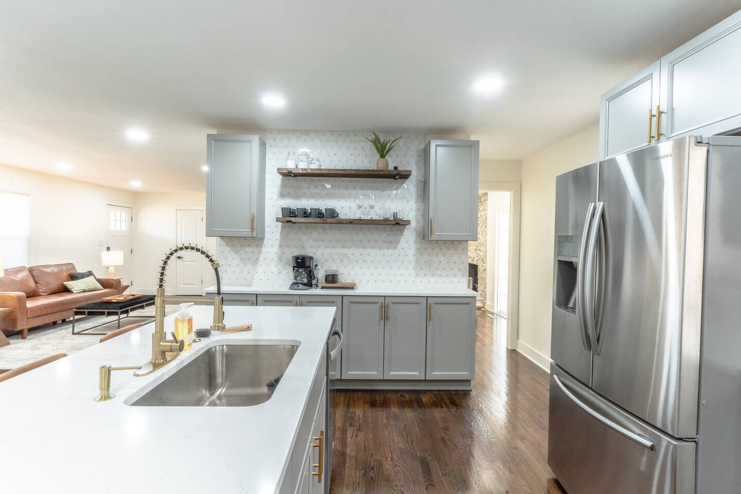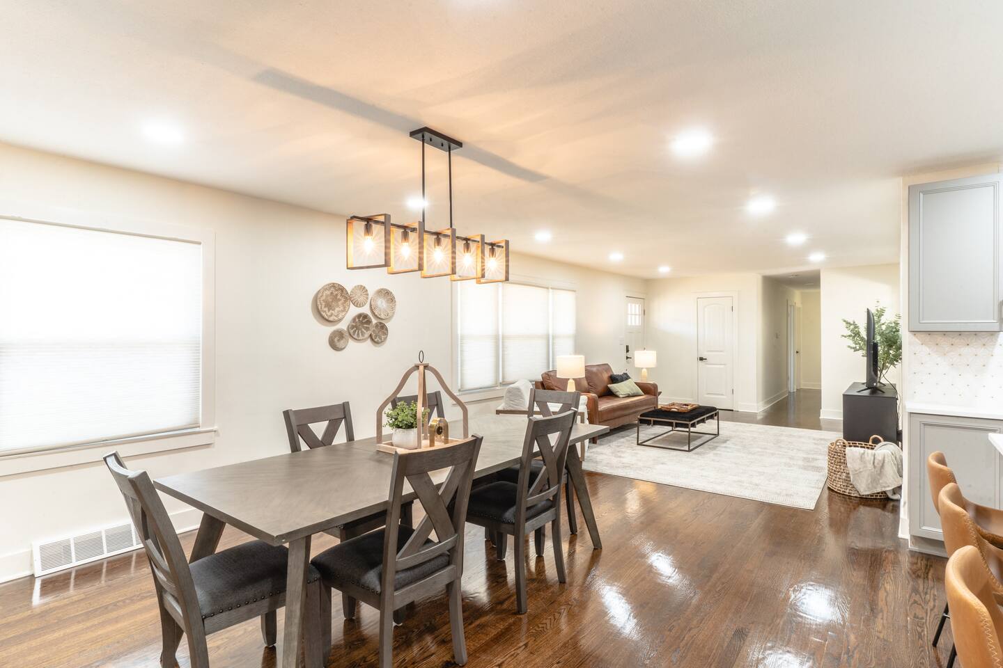 Our comfy & spacious home is newly & completely renovated on the interior and exterior! Enjoy PLENTY of space with an open concept floorplan WITH an additional family room tucked away in the back of the home and a spacious basement. Kick off your shoes & enjoy your stay at our modern home with new quartz countertops, gas stove for cooking, refrigerator to store your groceries, and a downstairs wet bar area to store additional beverages. The home boasts 5 spacious bedrooms (6 Beds) with plenty of closet space to store clothing and a variety of bed sizes from 2 Kings, 2 Queens, and 2 Twin sizes. All bedrooms come with a television set with access to different streaming apps. Our home includes 3 full bathrooms with plenty of vanity space for all our guests. Home is located in the highly sought-after Overland Park area. Just minutes from multiple shopping centers, restaurants, and highway access to get ANYWHERE in the city quickly.