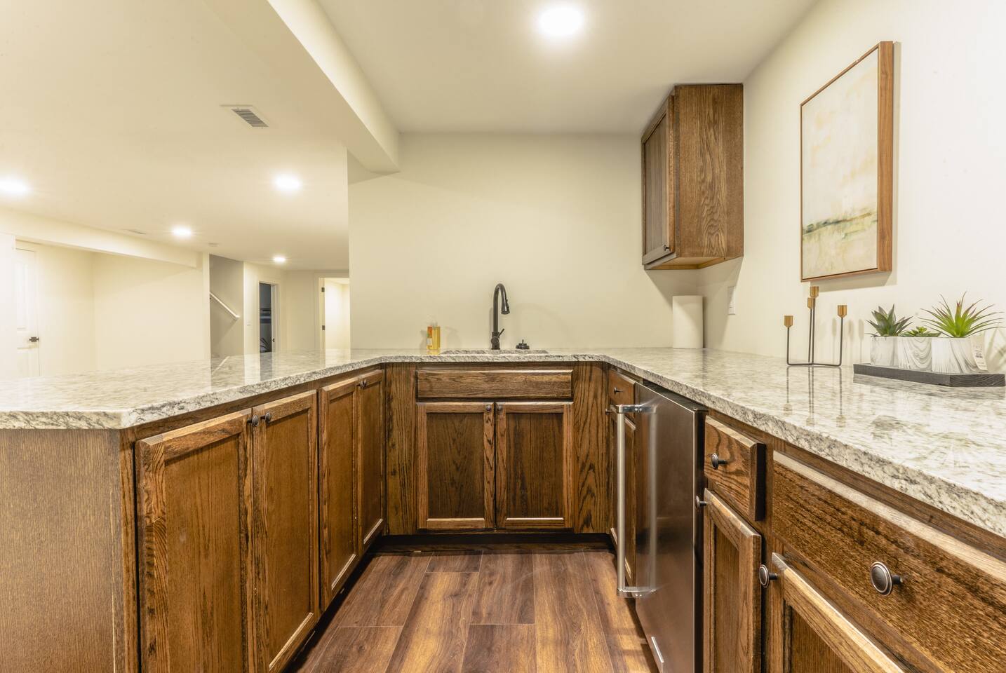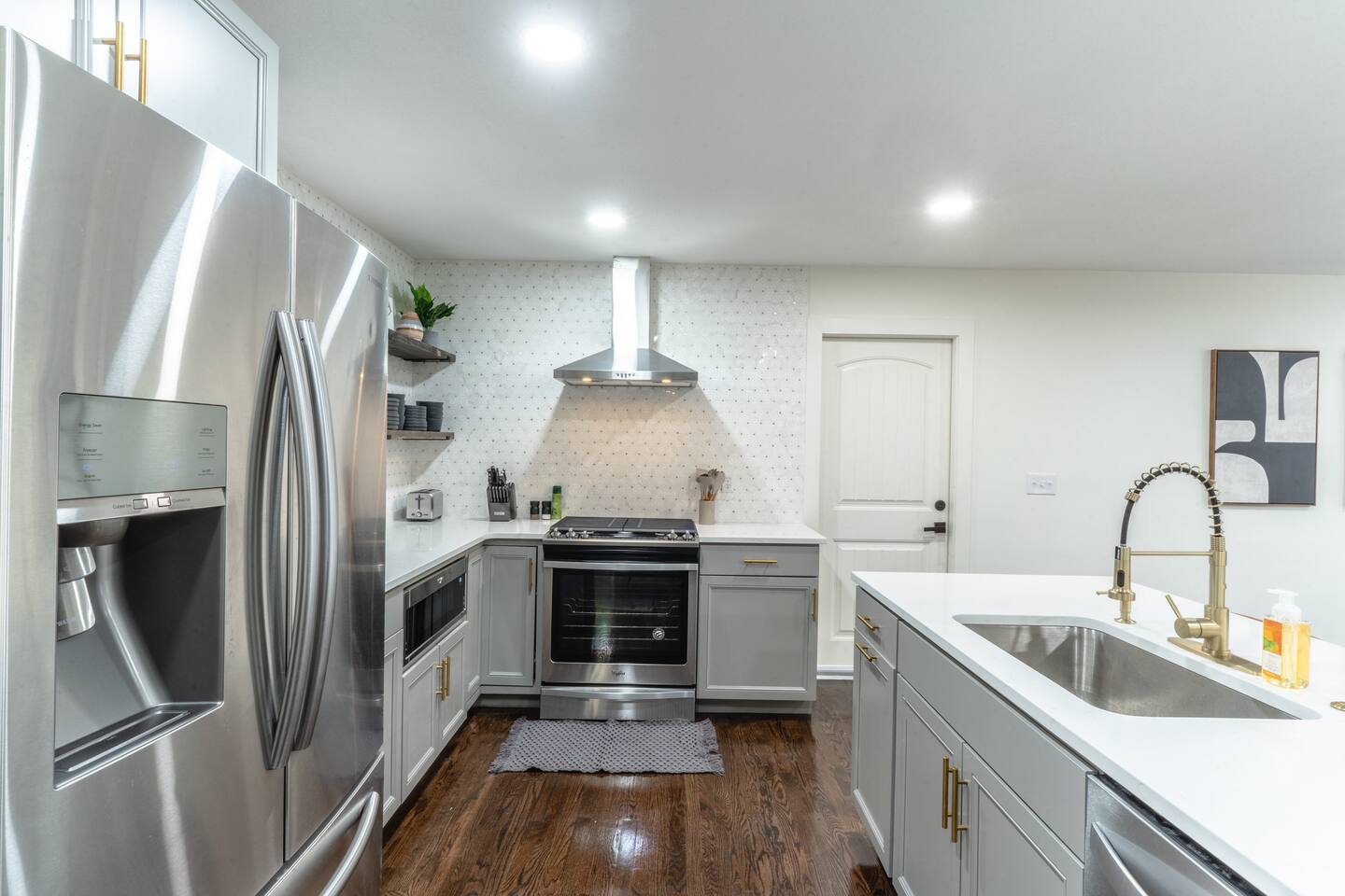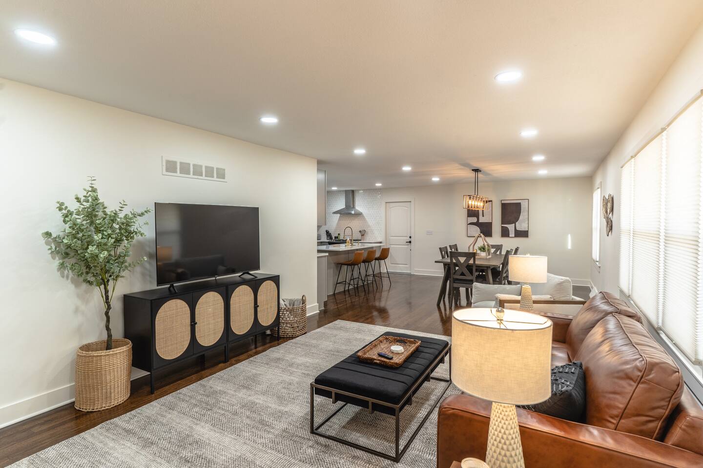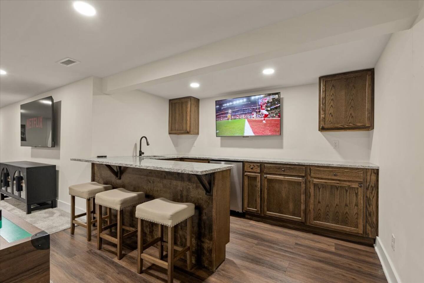 Our comfy & spacious home is newly & completely renovated on the interior and exterior! Enjoy PLENTY of space with an open concept floorplan WITH an additional family room tucked away in the back of the home and a spacious basement. Kick off your shoes & enjoy your stay at our modern home with new quartz countertops, gas stove for cooking, refrigerator to store your groceries, and a downstairs wet bar area to store additional beverages. The home boasts 5 spacious bedrooms (6 Beds) with plenty of closet space to store clothing and a variety of bed sizes from 2 Kings, 2 Queens, and 2 Twin sizes. All bedrooms come with a television set with access to different streaming apps. Our home includes 3 full bathrooms with plenty of vanity space for all our guests. Home is located in the highly sought-after Overland Park area. Just minutes from multiple shopping centers, restaurants, and highway access to get ANYWHERE in the city quickly.